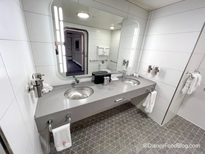 The bathroom in the suite is larger than the ones in the regular cabin. In here, you’ve got double sinks on the vanity, so there’s plenty of room for multiple people to use the bathroom counter at once.