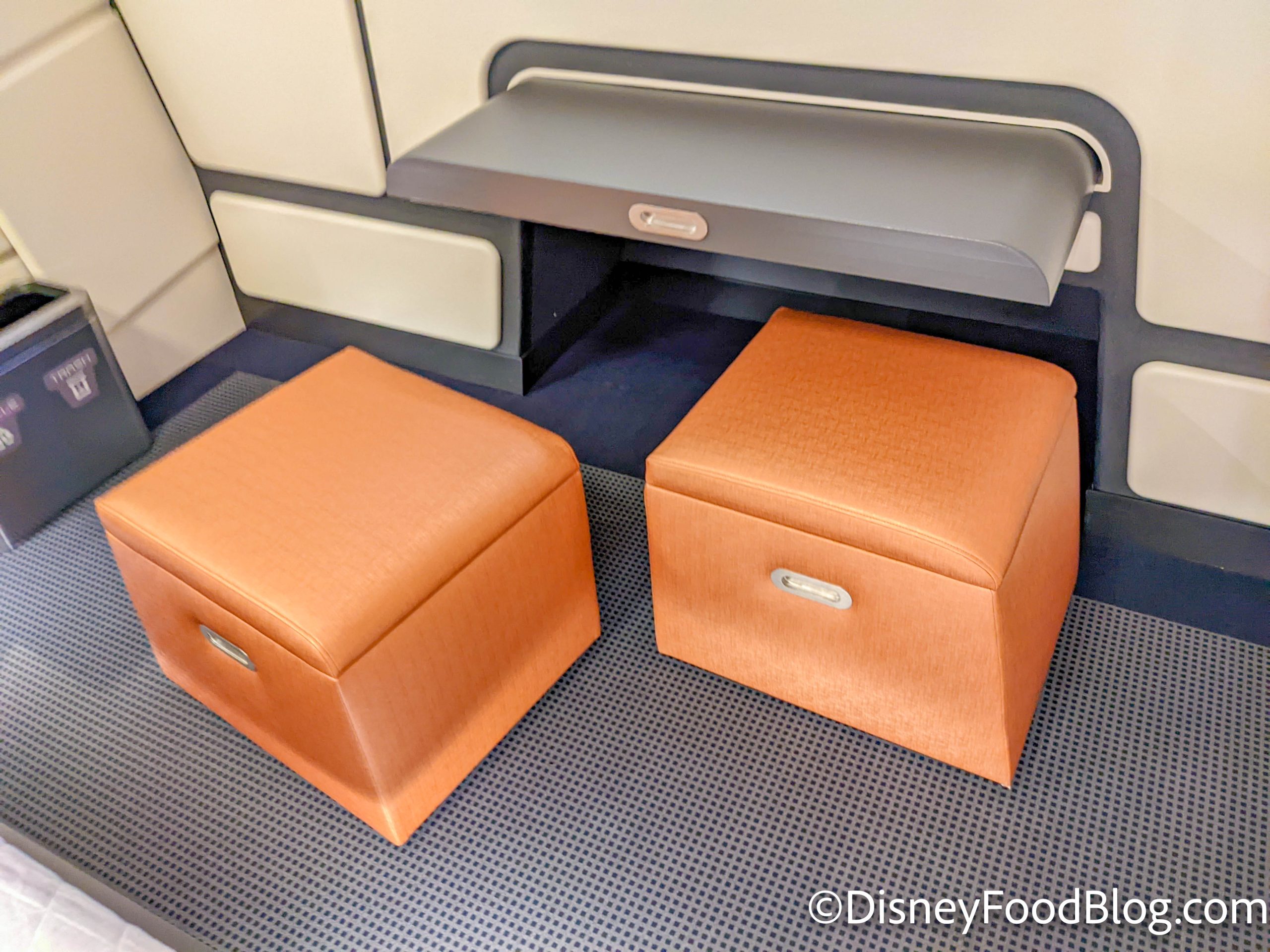 Like any other hotel room, you’ve also got a table and chairs…although it’s definitely not the traditional setup that you’re used to. A small table pulls out from the wall, along with two orange stools underneath it. It’s not really made for extended sitting, but it’s a good place to enjoy a snack and take a break for a moment.