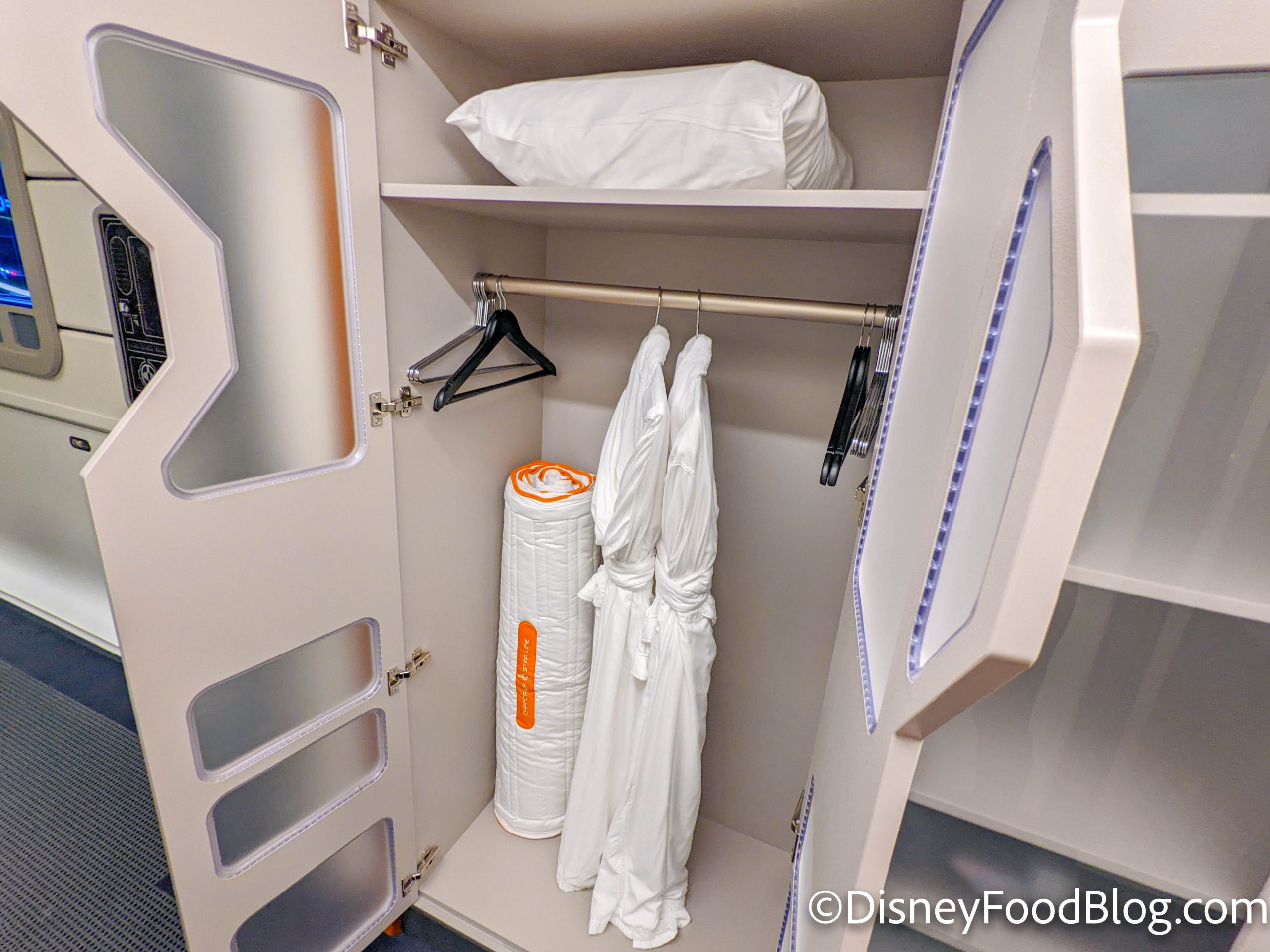 The next cabinet over is home to a hanging rack for your clothes. Already in here, we found two Chandrila Star Line robes, an extra blanket, and an extra pillow. (These would likely be used by the person who sleeps on the room’s pull-down bed.)