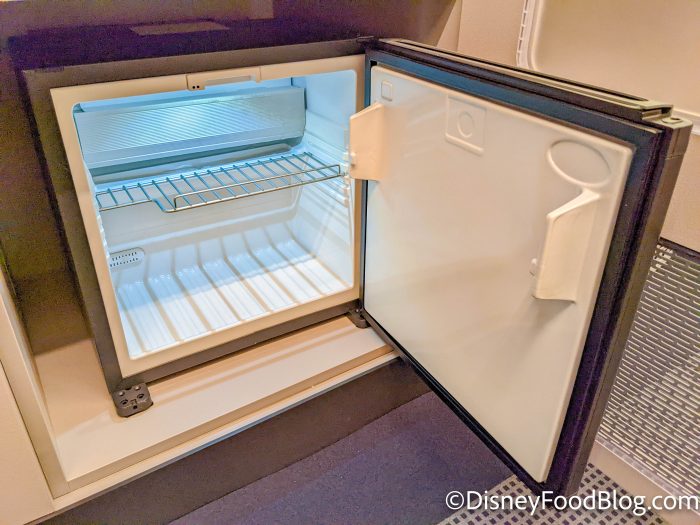 What else makes these suites unique? Well, each one comes with a kitchenette! There’s a bar area with stools and a countertop. Behind the counter, you’ve got a small sink, a storage area with some dishes, and a mini-fridge. This model is a little bit bigger than the one that was in our Standard Cabin.