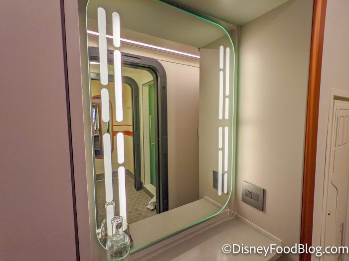 On that same wall is a TV that can link and is equipped with the same channels you’d have on a regular Disney hotel TV (because the Chandrila Star Line wants to make sure that us earthlings have access to our favorite entertainment!) as well as the pull-down bed.