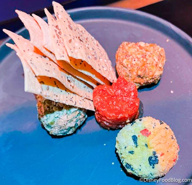 The white cheddar was really good but wasn’t super sharp or anything. It basically tasted like a classic cheese ball and was good. There were also some Lavosh crackers that came with it which were quite good — very tasty and crackly, and they broke right apart. The Cast Members brought us some extras, but you could also order some extras if you want to go with your cheese. We didn’t really get a spicy jalapeño flavor though, so don’t let that scare you.