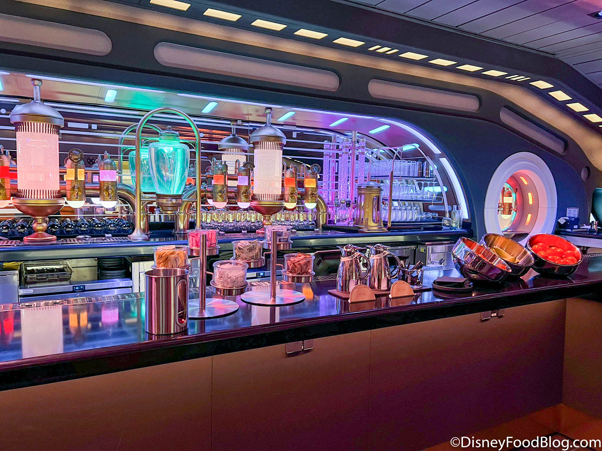 - You want some themed space-y drinks. Many of the drinks here are ones you can find in other parts of the ship, but if you’re looking for a space-y alcoholic (or non-alcoholic drink) to get during your day, or you want some kind of custom (non-space-y drink) you can stop by here to grab one, take a seat, and just enjoy the atmosphere.