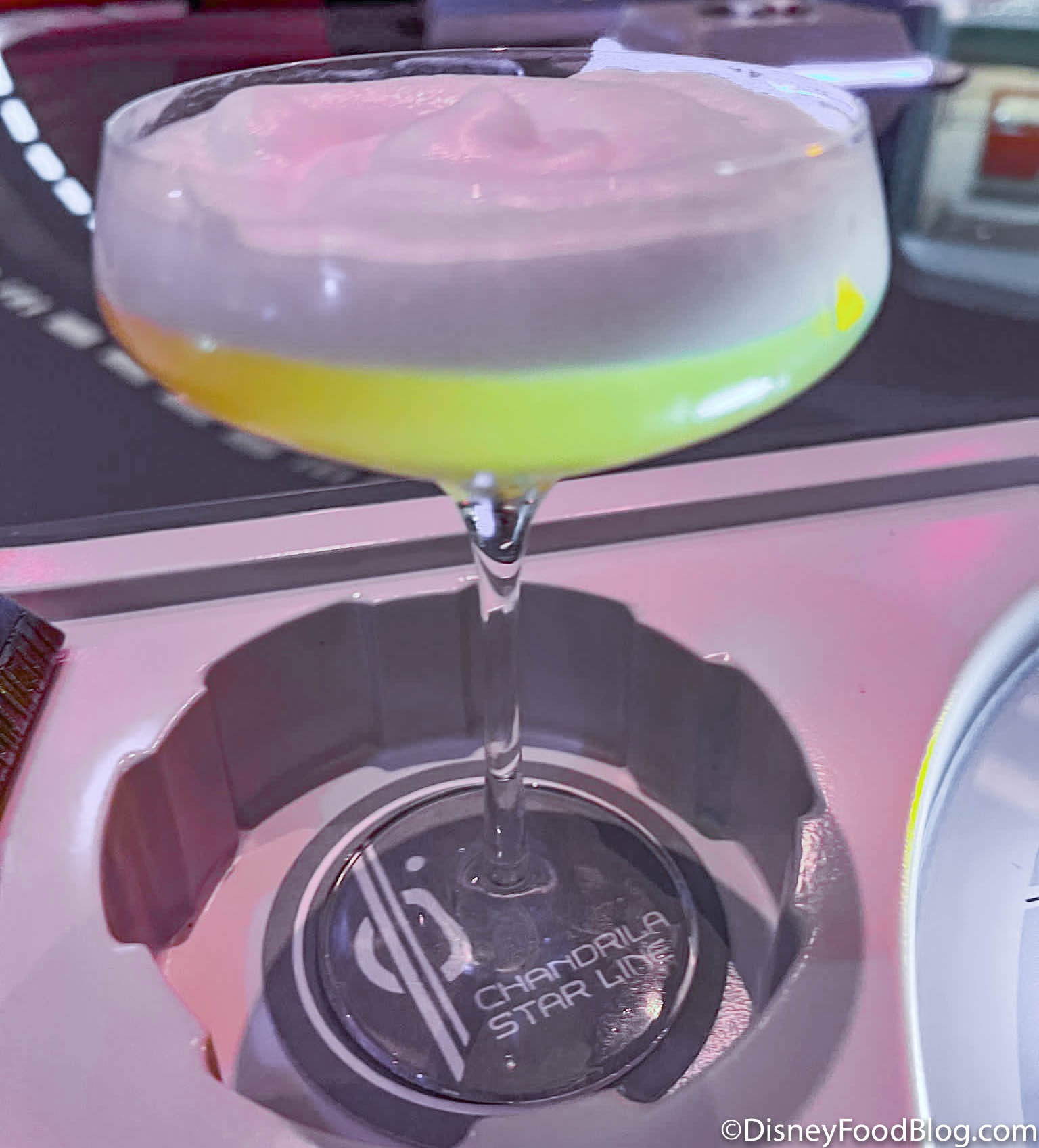 During another part of our trip (while at the Crown of Corellia Dining Room) we also got to try the Dagobah Vimlet, but we wanted to make sure we included it here so you could get our full thoughts (since it is also something you can get at Sublight Lounge). At Sublight Lounge, you can get this drink for $15. It is made with vodka, herbaceous orange liqueur, lime, and peppercorn, and is essentially like a vodka gilmet.
