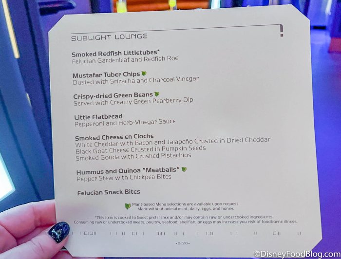 - You want more substantial food. Sublight Lounge has some small plates and snacks (which we LOVED), but it’s not exactly a full meal. If you’re looking for a full meal, you’ll want to head to the Crown of Corellia Dining Room during the designated eating times to really fill up.