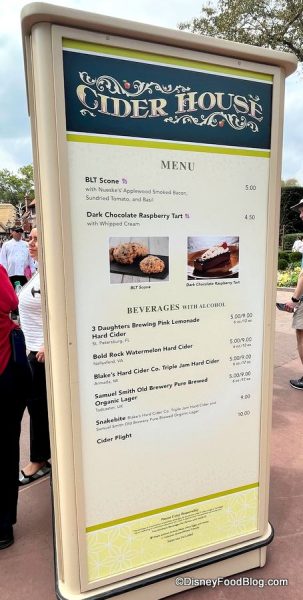 Over in the U.K. pavilion is Cider House! This year’s menu has a new item — the BLT Scone for $5. And the Dark Chocolate Raspberry Tart is back for $4.50 (previously $4.25).