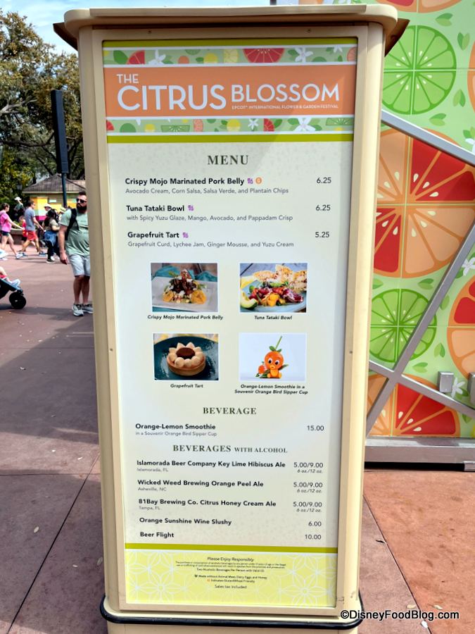 Next, we saw the menu was up for The Citrus Blossom in the World Showcase Plaza. New items over here include the Crispy Mojo Marinated Pork Belly for $6.25 and the Grapefruit Tart for $5.25.