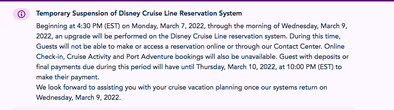 During that time, guests won’t be able to make or access any Disney Cruise Line reservations online or through the contact center. Online check-in, and cruise activity and port adventure bookings also won’t be available during that time.