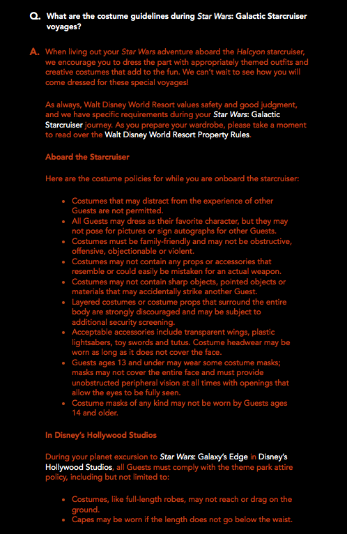Before we get into your costume questions, here’s a look at Disney’s costume policy for the Star Wars hotel.