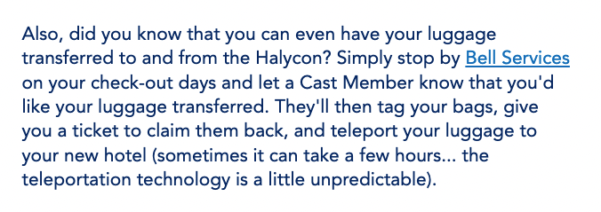 Previously, there were no luggage transfers available (to Disney World hotels or otherwise), so you had to take your luggage with you. On April 15th, 2022, a planDisney response, however, indicated that guests can have their luggage transferred to and from the Halcyon (and other Disney World hotels). Be sure to chat with Bell Services to ensure what the situation is like for your trip.