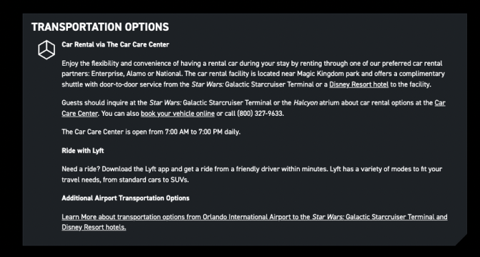 One page on the Disney website specifically notes “If you are staying at a Disney Resort hotel before or after your Star Wars: Galactic Starcruiser voyage, transportation to or from your Disney Resort hotel is also included.”