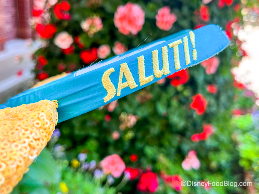 But, our absolute favorite parts about these ears are the little details! There’s an adorable little lemon charm with a Mickey silhouette on the bow, and the side of the headband reads “Saluti!” which is Italian for “cheers” or “greetings.”