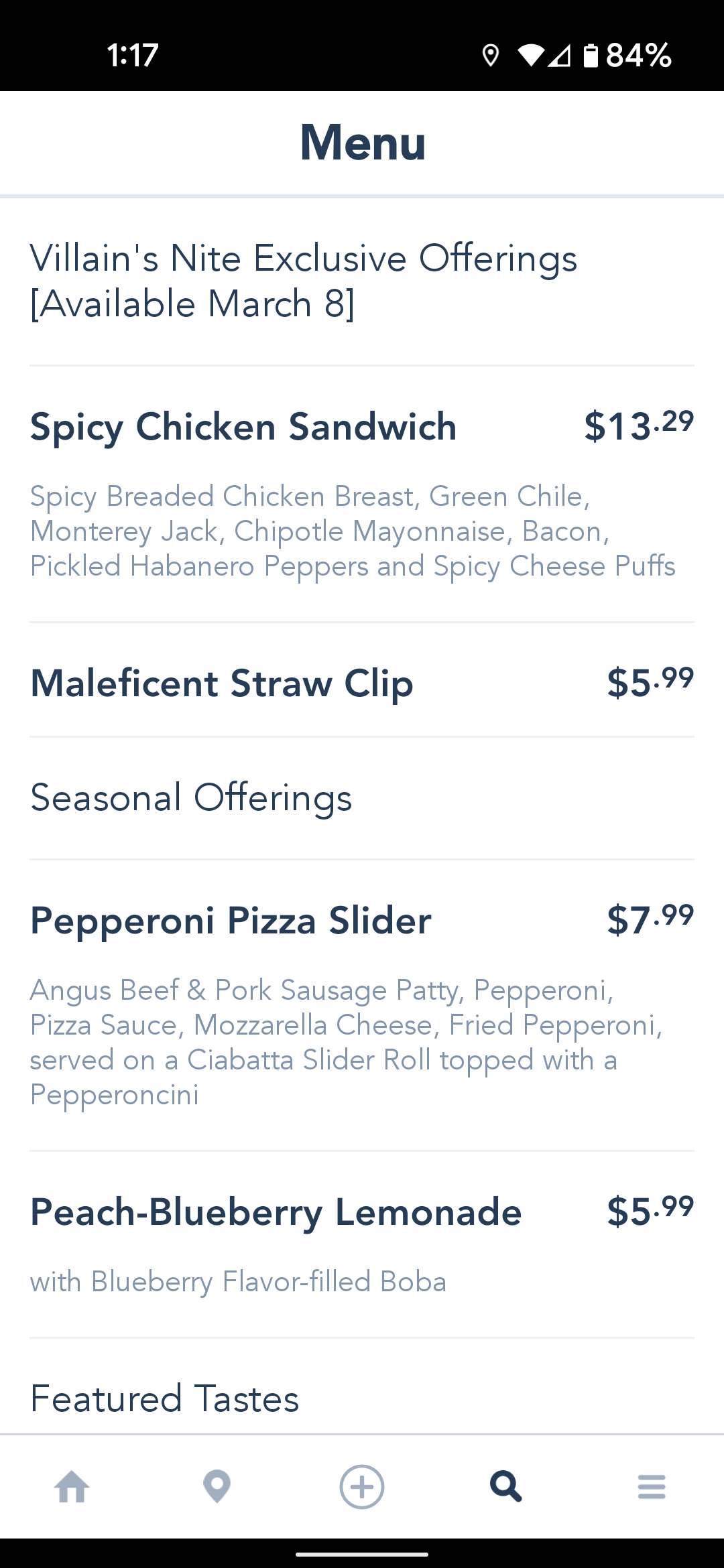 At Smokejumpers Grill, you can try the Spicy Chicken Sandwich for $13.29, made with Spicy Breaded Chicken Breast, Green Chile, Monterey Jack, Chipotle Mayonnaise, Bacon, Pickled Habanero Peppers, and Spicy Cheese Puffs on a Toasted Bun, topped with a Sweet Piquanté Pepper and served with Waffle-cut Fries or Onion Rings. A Maleficent Straw Clip is available here, too, for $5.99.