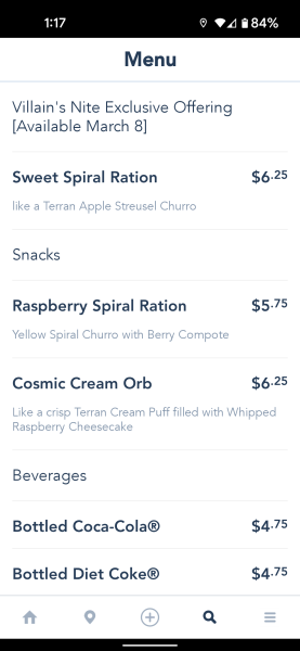 At Terran Treats, enjoy a Sweet Spiral Ration, which is described as “like a Terran Apple Streusel Churro” for $6.25.