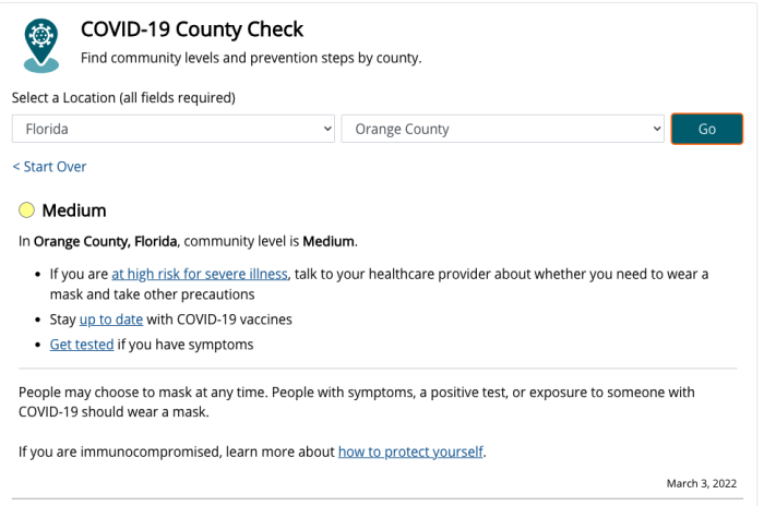 Orange County, Florida (where the majority of Disney World is located) is now in the Medium category of community transmission. This means people in this county who are at high risk for severe illness should talk to their healthcare providers about whether they need to wear a mask and take other precautions. People should also stay up to date with COVID-19 vaccines and get tested if they have symptoms.