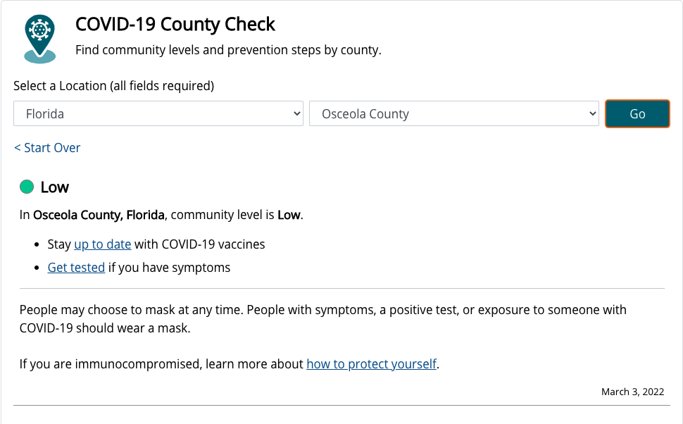 Osceola County, Florida (where the remainder of Disney World is located) is now in the Low category of community transmission. This means people in this county should stay up to date with COVID-19 vaccines and get tested if you have symptoms, according to the CDC.