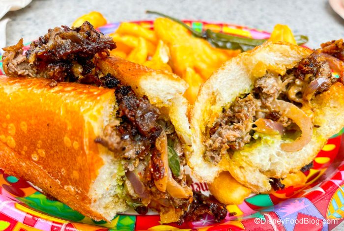 So we did what we do — we ordered both! The Southwest Cheesesteak is made with Thinly-sliced Steak with Caramelized Onions, Poblano Peppers, Pepper Jack, Guacamole, and Chipotle Aїoli on a toasted Baguette, served with Cuties Mandarin Oranges or Filmstrip Fries — yes, we opted for fries. So here’s the thing — this takes a little bit longer to make than other items on the menu here — a Cast Member told us about 9 minutes total.