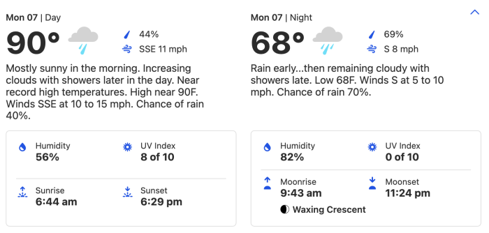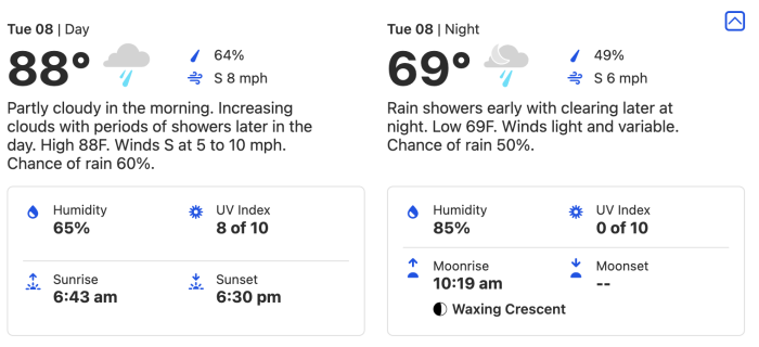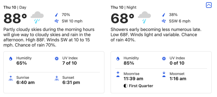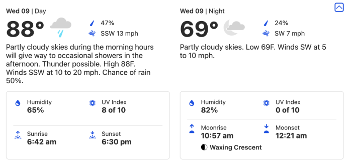 On Thursday, March 10th, the temperature reaches 88° (again), with a 70% chance of rain. The low is 68°, with 60-80% (ish) humidity throughout the day. The wind is predicted to come in at 10 to 15 mph, so pack a jacket if you can!