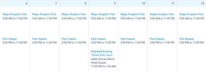 This week, Magic Kingdom is open from 9AM until 11PM every day, with Extended Evening Hours from 11PM until 1AM on March 9th! That means that guests eligible for Extended Evening Hours could spend 16 (!!!) hours in Magic Kingdom on Wednesday!