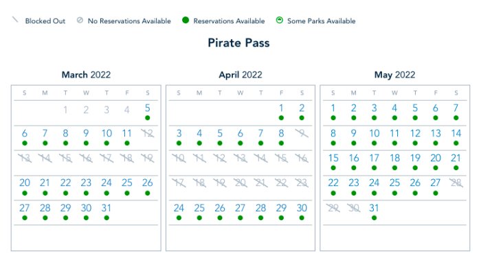 Pirate Pass Holders can make a reservation at any of the four parks every day this week except for Saturday, March 12th, which is blocked out.