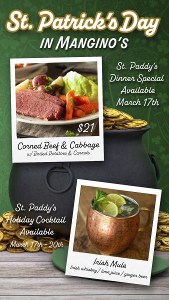 And over at Evergreens, get the Reuben with a green beer! Or, if you’re more of a traditionalist, Mangino’s is serving up corned beef and cabbage with an Irish Mule!