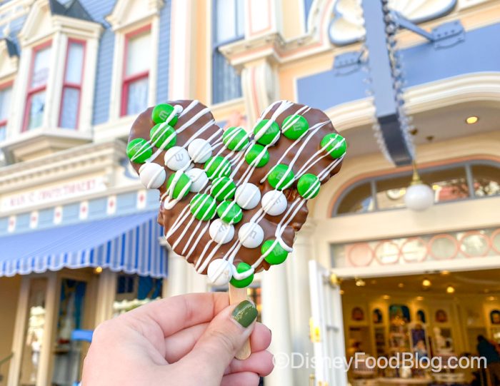 The Main Street Confectionery has St. Patrick’s day-themed treats! We found a LOT of green and white decorations on all the classic Confectionery treats, like the caramel apples, Mickey rice krispies, and marshmallows.