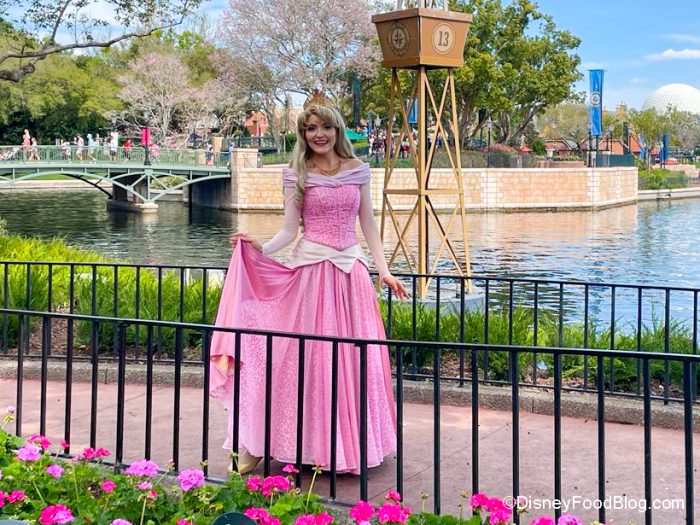 She’s wearing a beautiful blue-to-pink ombre gown with a tiara-like addition at the top of her dress as well. You can even see images of Sleeping Beauty Castle on the bottom of the gown!