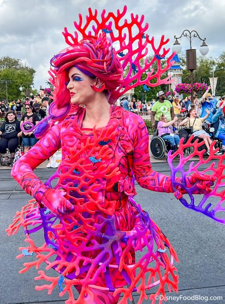 The Little Mermaid float is a chariot. But, it is introduced by these absolutely fabulous fish dancers!