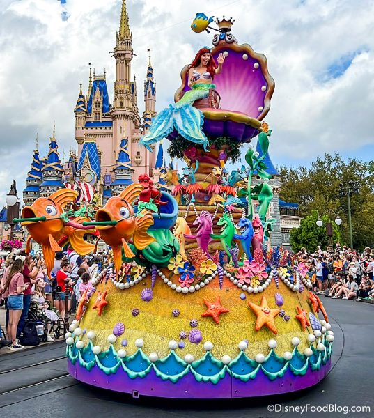 The float has all kinds of sea creatures and treasures, and Ariel herself is on top with Flounder.