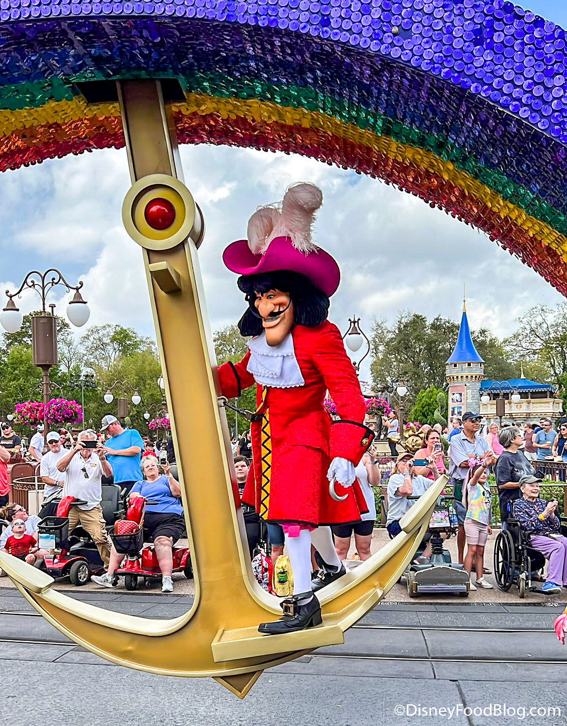 …and Captain Hook is underneath the rainbow swinging on a giant anchor!
