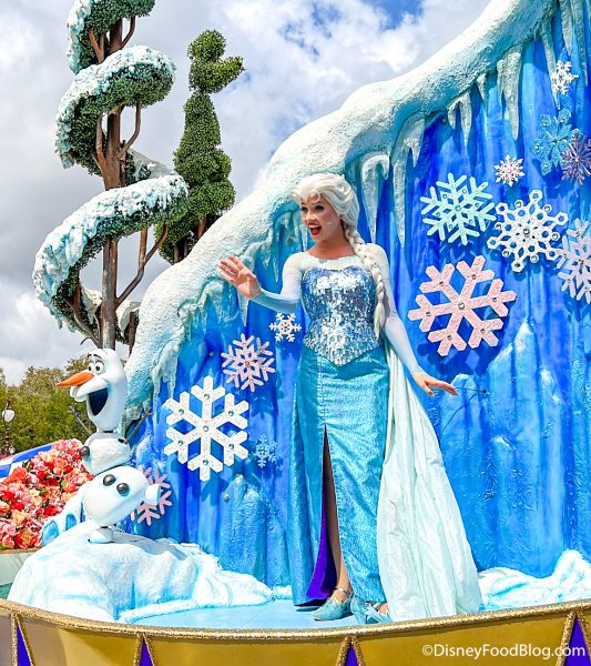 …and Elsa! They’re greeting guests from a float that looks like a royal garden.
