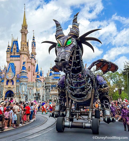 Then, we see the return of the Maleficent Dragon float! This is a huge steampunk-style dragon that actually breathes fire. Watch for cool details like a spinning wheel inside the dragon’s ribcage!