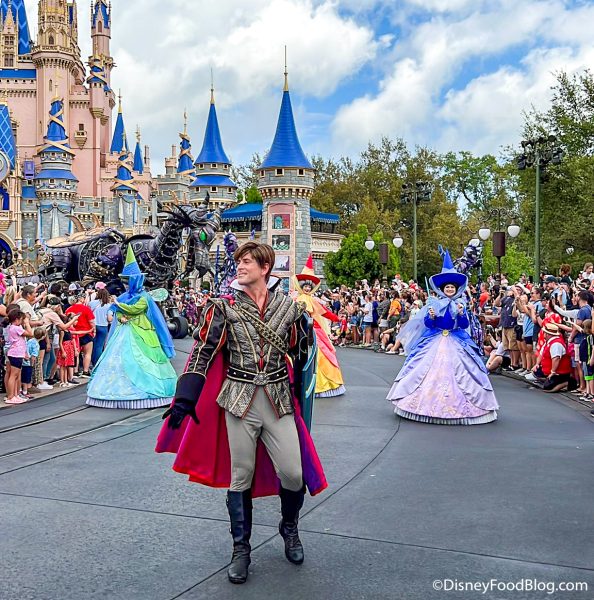 Up next, introducing a very intimidating float, you’ll spot Prince Phillip and Flora, Fauna, and Merryweather.