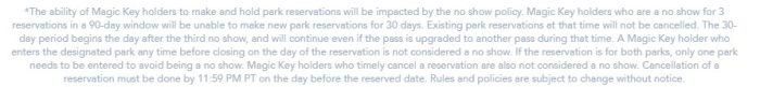 The policy states that “Magic Key holders who are a ‘no show’ for 3 reservations in a 90-day window will be unable to make new park reservations for 30 days. Existing park reservations at that time will not be canceled.”