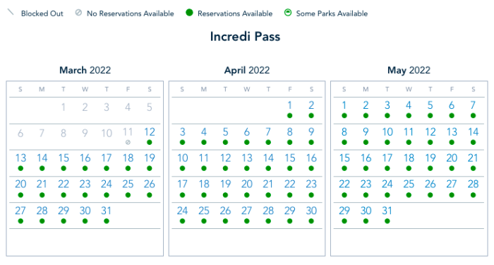 There are 4 different annual passes, each with different reservation availabilities, so let’s take a look! Incredi Pass Holders can make a reservation at any of the four parks every day this week…