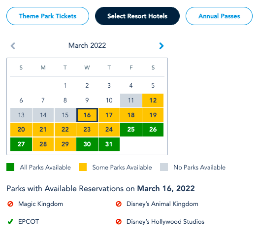 Select Resort Hotel Guests have similar availability and can only make reservations for the 16th through 19th next week and the 13th through 15th are also completely booked. Additionally, on March 16th, 17th, and 18th, the only park available for reservations is EPCOT, and on the 19th, all of the parks are available except for Magic Kingdom.