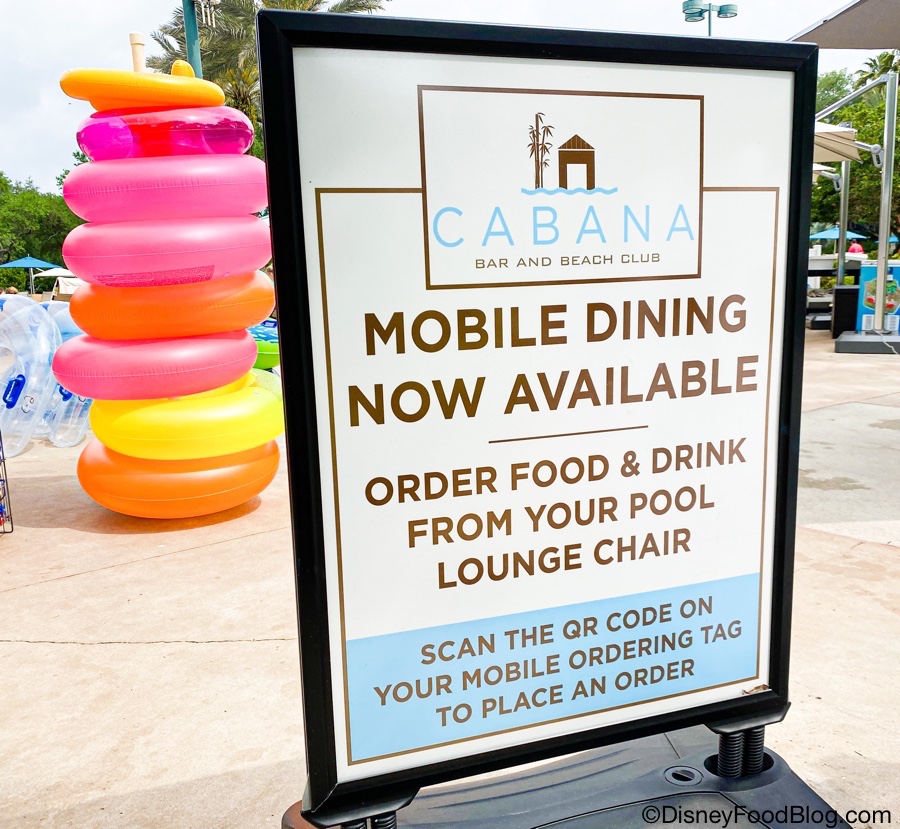 First, let’s talk about the atmosphere. As mentioned, this spot has a GREAT poolside location with covered tables, cabanas, and comfy couches with ottomans. Plus, you can Mobile Order from your pool chair!