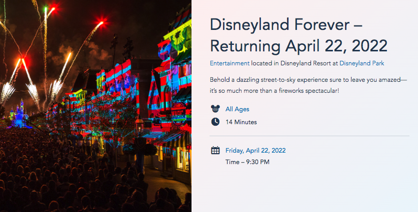 And, between the parade, we now know that the Disneyland Forever fireworks show will take place at 9:30PM! This show lasts 14 minutes but keep in mind that it will only be running on weekends only (Friday through Sunday) when it first comes back on April 22nd.