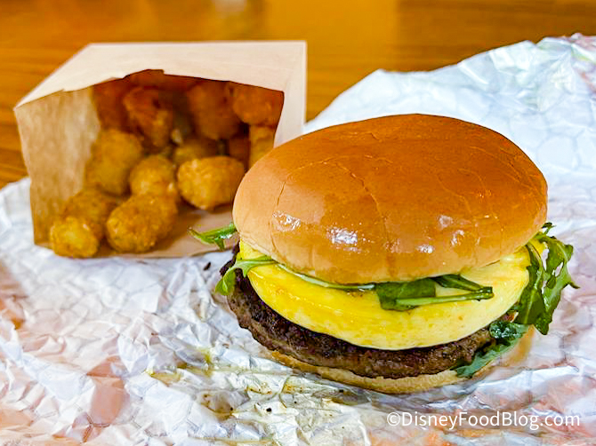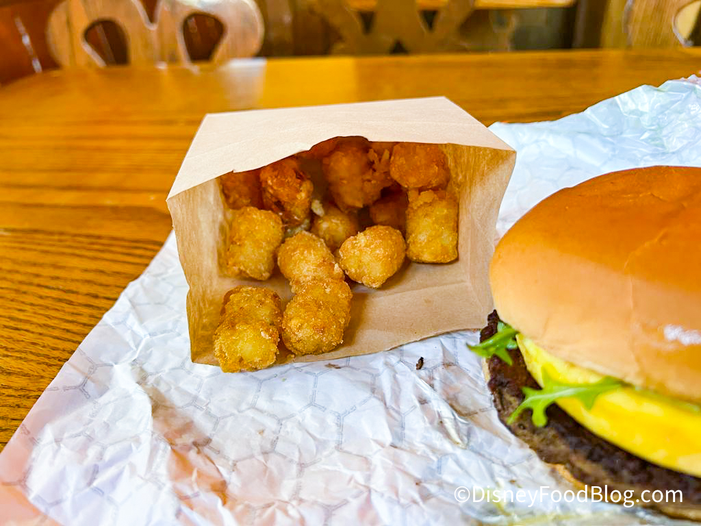 This burger was served with warm tater tots, which were also delicious! Overall, if you don’t like eggs or bacon, then you might want to skip this meal, even though the egg is really easy to remove. There are just so many more options for tasty food in Disneyland, so you can easily find a different meal that you’ll enjoy completely, without having to remove ingredients. But we’d definitely get this burger for breakfast again! And we think any other breakfast-lovers out there will enjoy it as well.