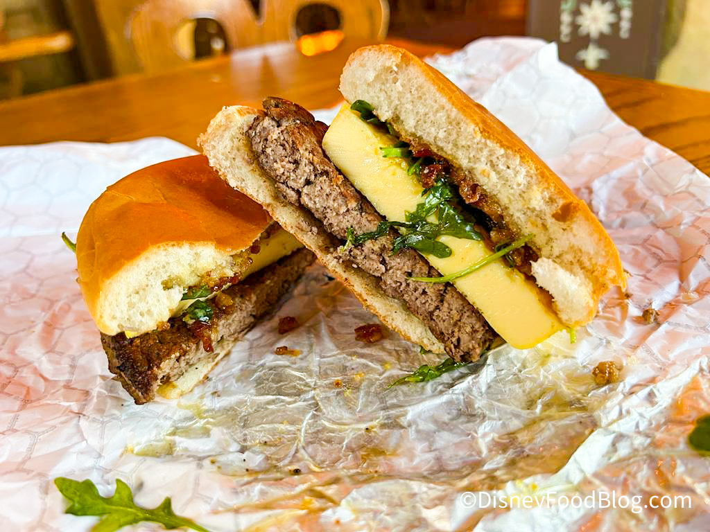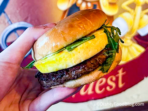 We tried the Beast’s Breakfast Burger at Red Rose Taverne in Disneyland! We had a version of this burger a few years ago, but it looks a little bit different today. It now has a 1/3 pound Angus beef patty, bacon-orange marmalade, an egg, and arugula on a toasted bun! Before, this burger had scrambled eggs instead of the more solid egg that’s on it now, and the bacon-orange marmalade has replaced the previous rosemary-maple cream cheese topping.