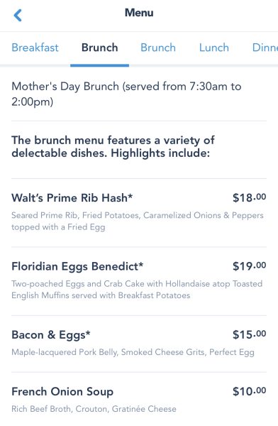 We found the Easter menu on the Disney World website, but if you visit the Steakhouse 71 menu in the My Disney Experience app, you’ll see a SECOND brunch menu! The same items will also be served during brunch on Mother’s Day from 7:30AM-2PM.