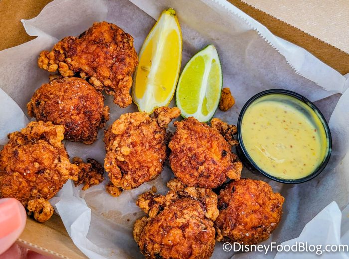 For $13, we got 7 fritters in our basket. They’re sweet cornbread fritters made with chopped shrimp and a mix of herbs and spices, all served with a honey mustard sauce on the side. As far as the taste goes, we thought there was just the right amount of shrimp inside, and that they were fried perfectly — crisp on the outside but still soft and pillowy in the middle.