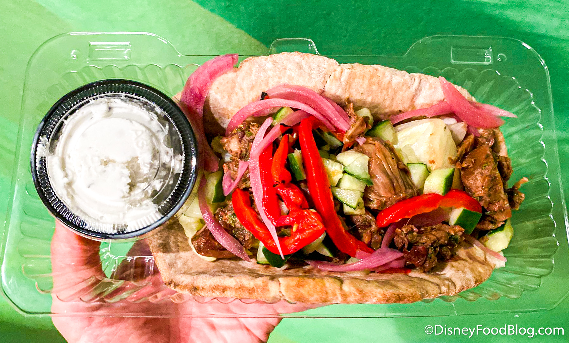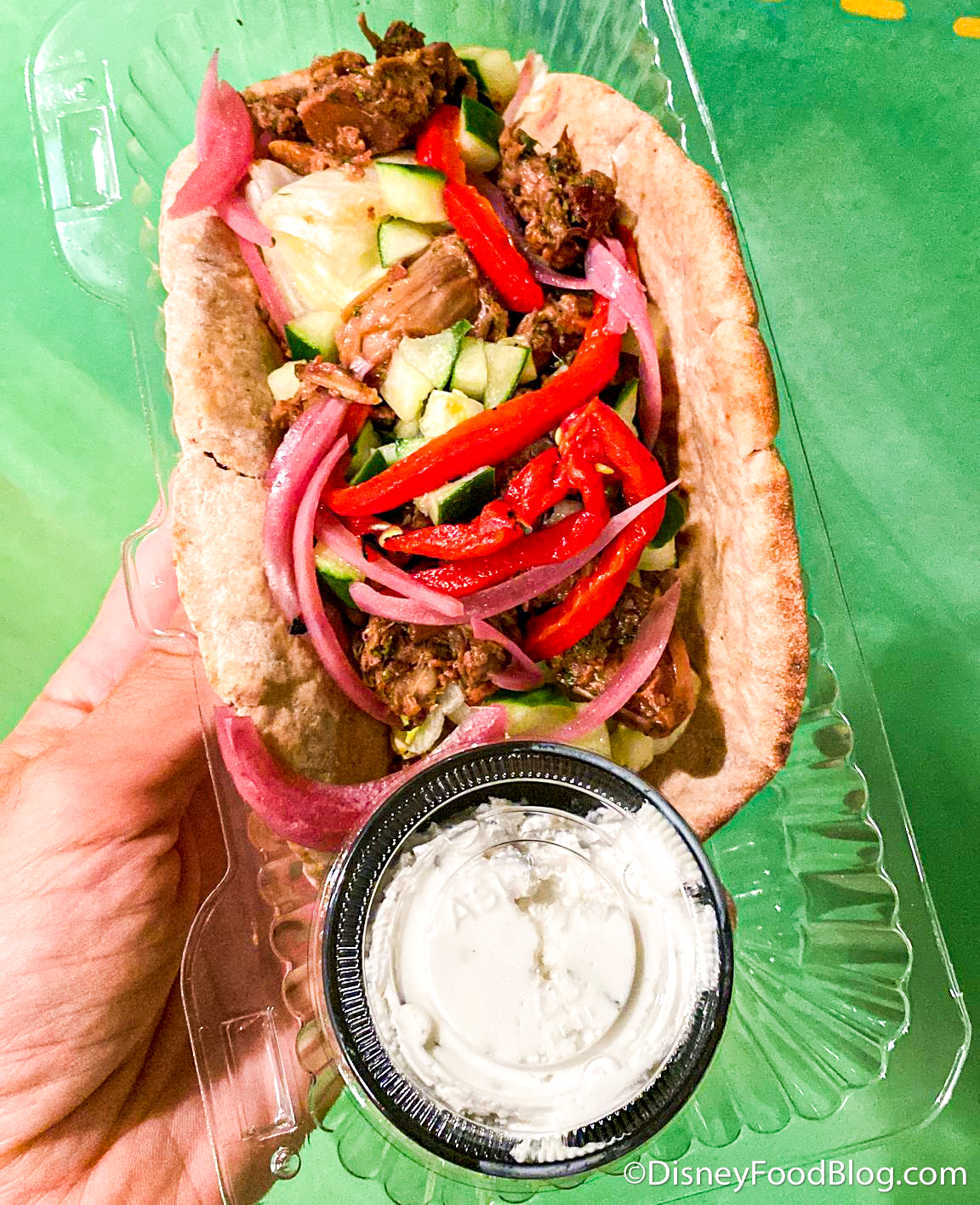 The tzatziki on the side seems to be made with coconut oil because it has a very strong coconut flavor to it. And, it was oily, like how the Coconut Lime Dole Whip was when we tried it a few months ago.