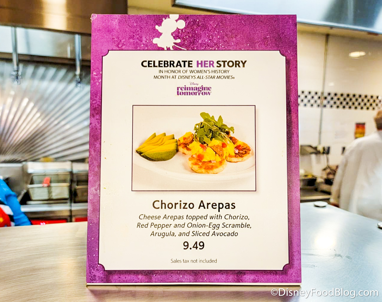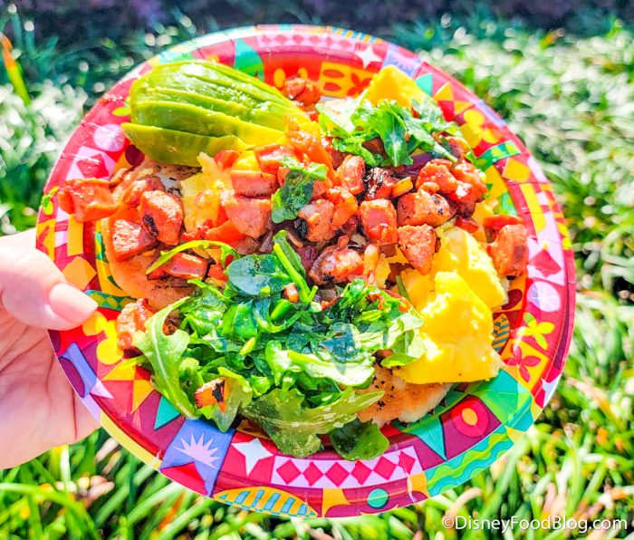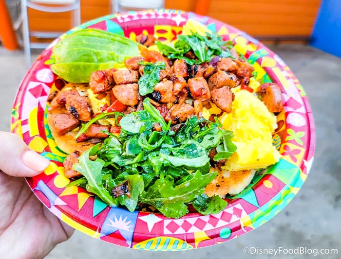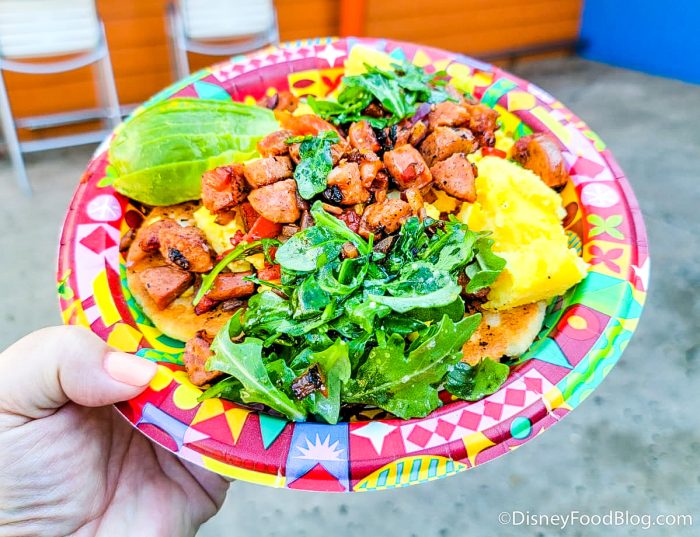They are cheese arepas topped with chorizo, red pepper and onion-egg scramble, arugula, and sliced avocado. You can find them over at the World Premiere Food Court at Disney’s All Star Movies Resort or at Landscape of Flavors at Disney’s Art of Animation Resort for $9.49.