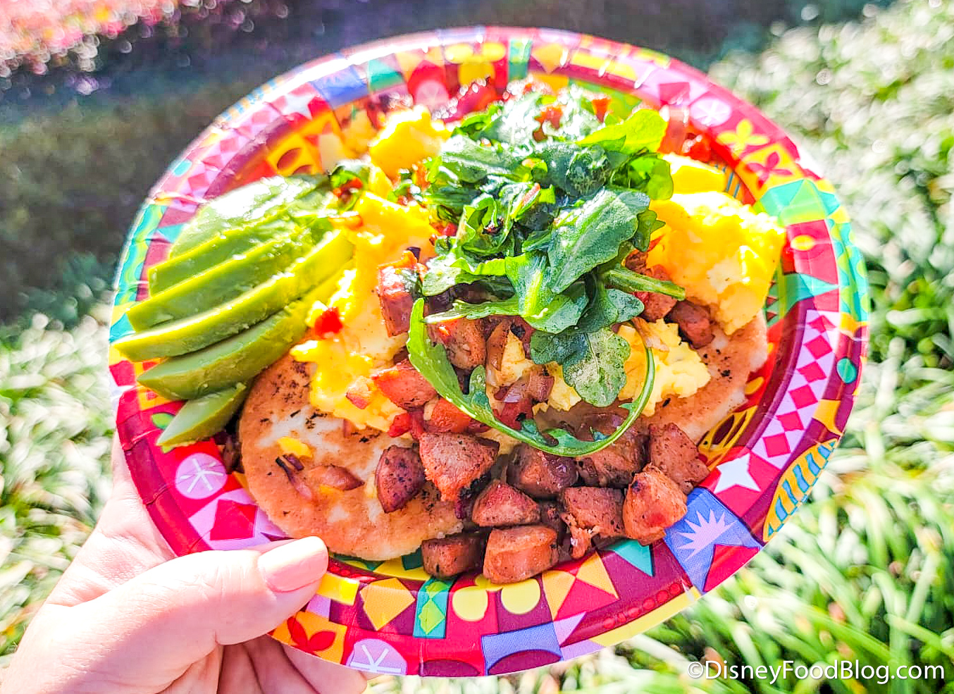 As you can see, this is a pretty big portion of food! It’s definitely a filling way to kick off your Disney World day. The arepas themselves have a great texture, and the chorizo and red peppers add just the right amount of spice to the dish.