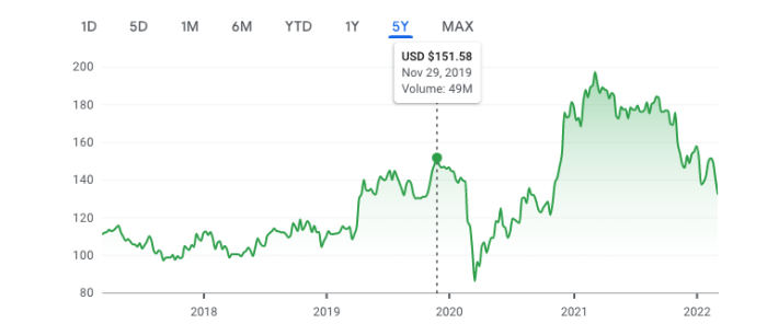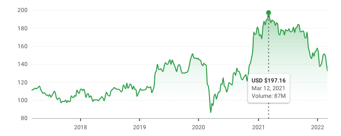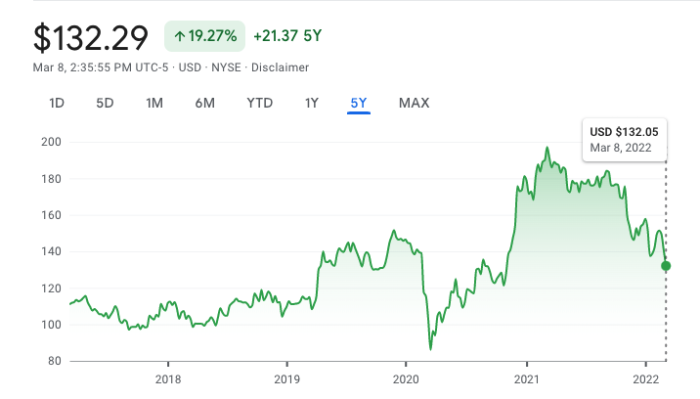 But, now things are on the decline again. As of March 8th, 2022, the stock is priced at around $132. That’s not as bad as the low hit in 2020 for sure, but not nearly as high as things were back in March of 2021.