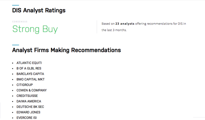 This is backed up by other reports with the Wall Street Journal noting that the consensus appears to be that Disney’s stock is overweight (meaning that analysts believe that the “stock price should perform better in the future”) and MarketBeat reporting that Disney “received an average rating of ‘Buy’ from the twenty-six brokerages that are currently covering the firm.” That’s a pretty strong showing of support for the stock.