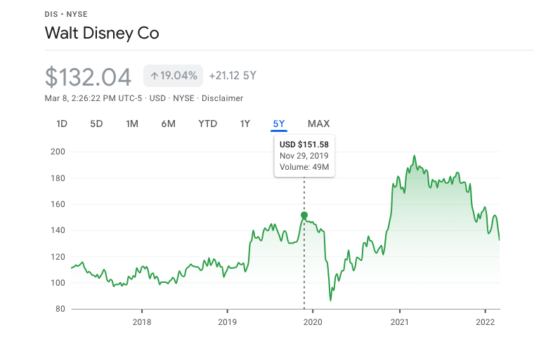 Since then though, things have declined a bit. On January 21st, 2022 the stock was at $137.38. The earnings call for Q1 of FY 2022 was then held on February 9th which led the stock values to increase up to around $151. Why the bump up? Well, the earnings call/report showed better than expected growth in Disney+ subscribers, record earnings for the parks, and more “good news” for investors.
