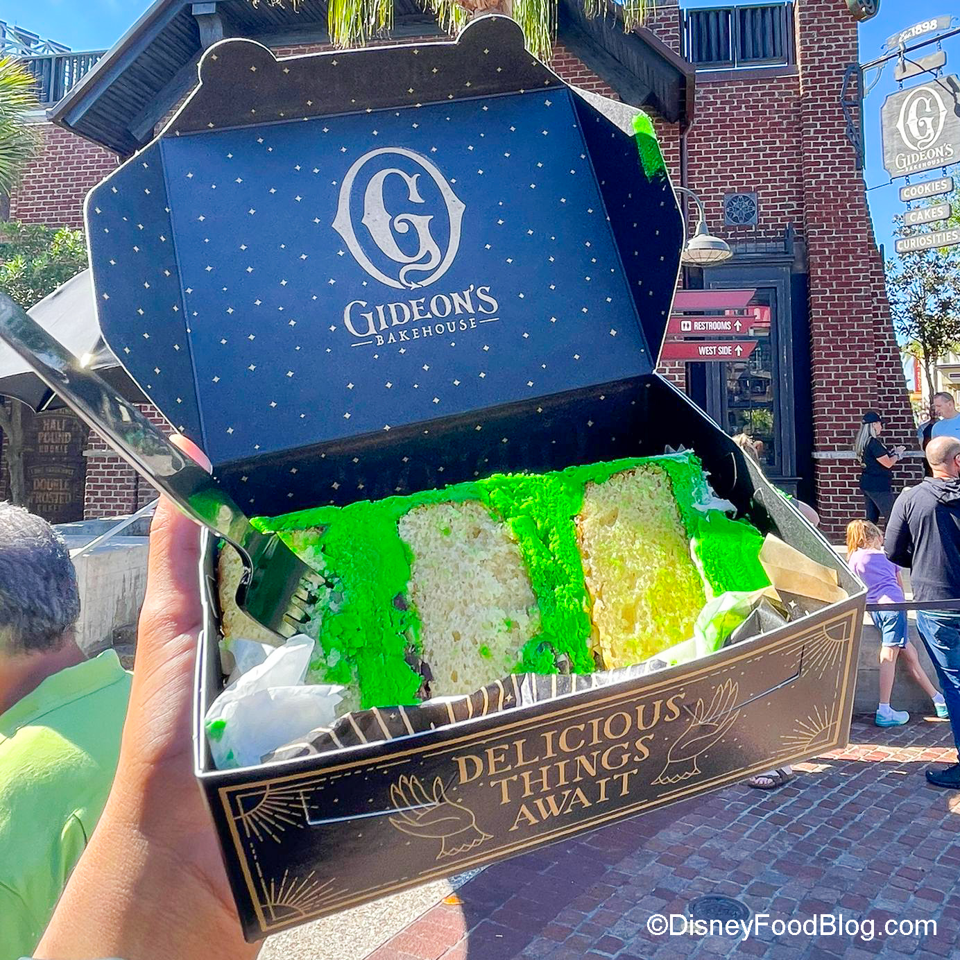 That’s right — it’s St. Patrick’s Day at Disney World! Although we’ve already tried our fair share of green snacks and drinks, including a VERY minty cupcake, an EXTREMELY green drink, a Mickey hat, and more, we’re heading to our beloved Gideon’s Bakehouse for MORE green treats — including GREEN CAKE.