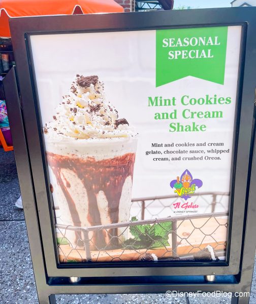 Today we stopped by Vivoli il Gelato in Disney Springs to pick up the new Mint Cookies and Cream Shake! It’s made with Mint and Cookies and Cream Gelato, Chocolate Sauce, Whipped Cream, and Crushed Oreos. One important thing to note here: IT’S NOT GREEN.